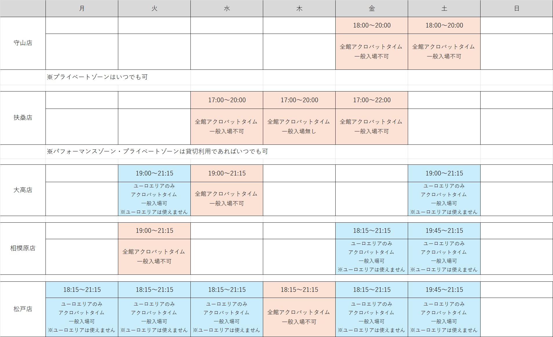 - 該当日が祝日となる場合、長期連休及びお盆・年末年始に関しては別途SNS等で各店のスケジュールをご確認ください